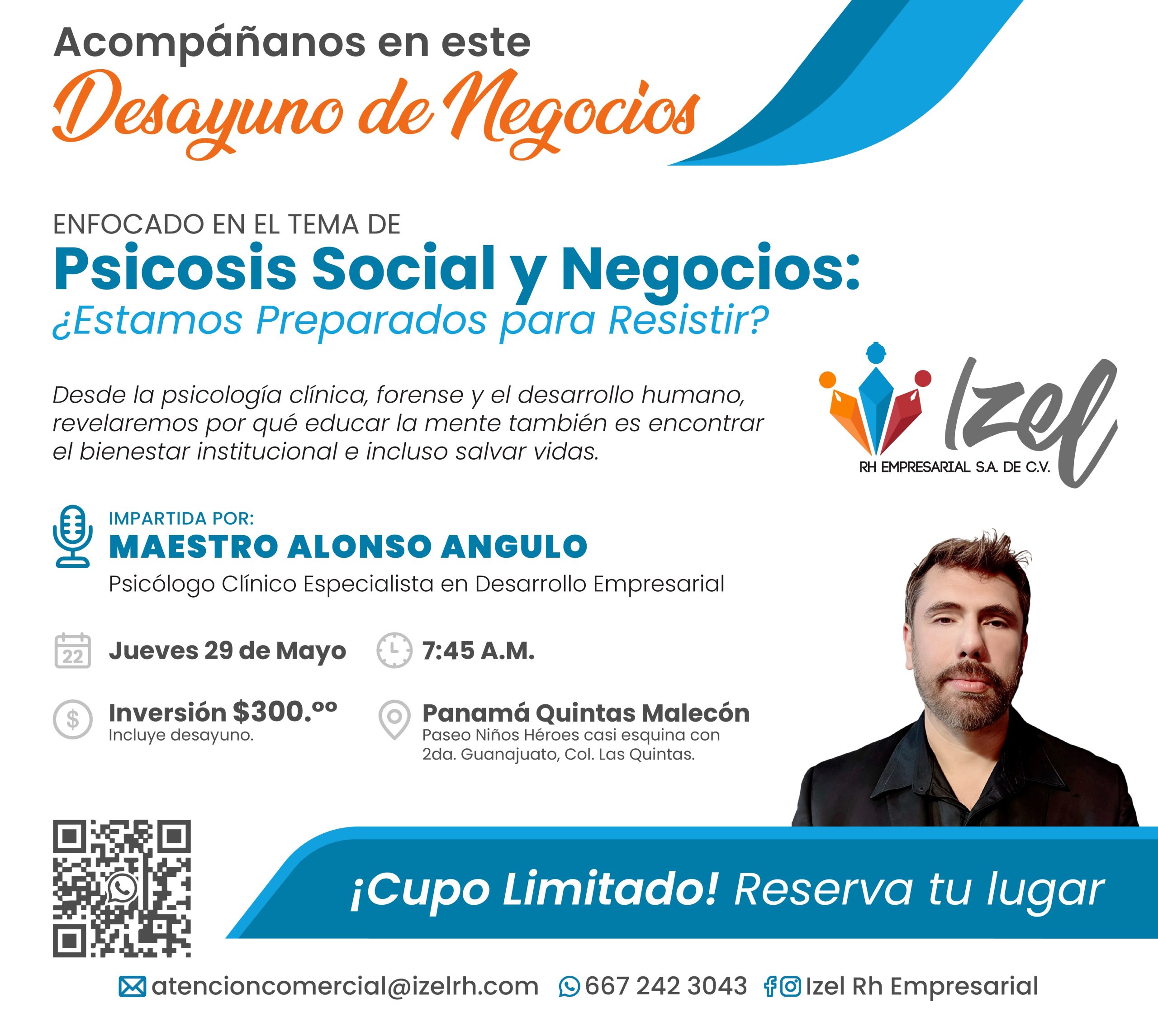 Acompañanos en este Desayuno de Negocio. Enfocado en el tema de psicosis Social y negocios: ¿estamos preparados para resistir?